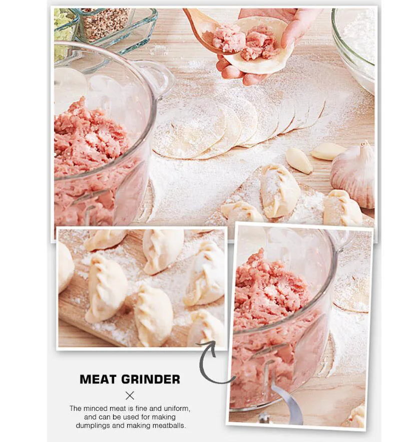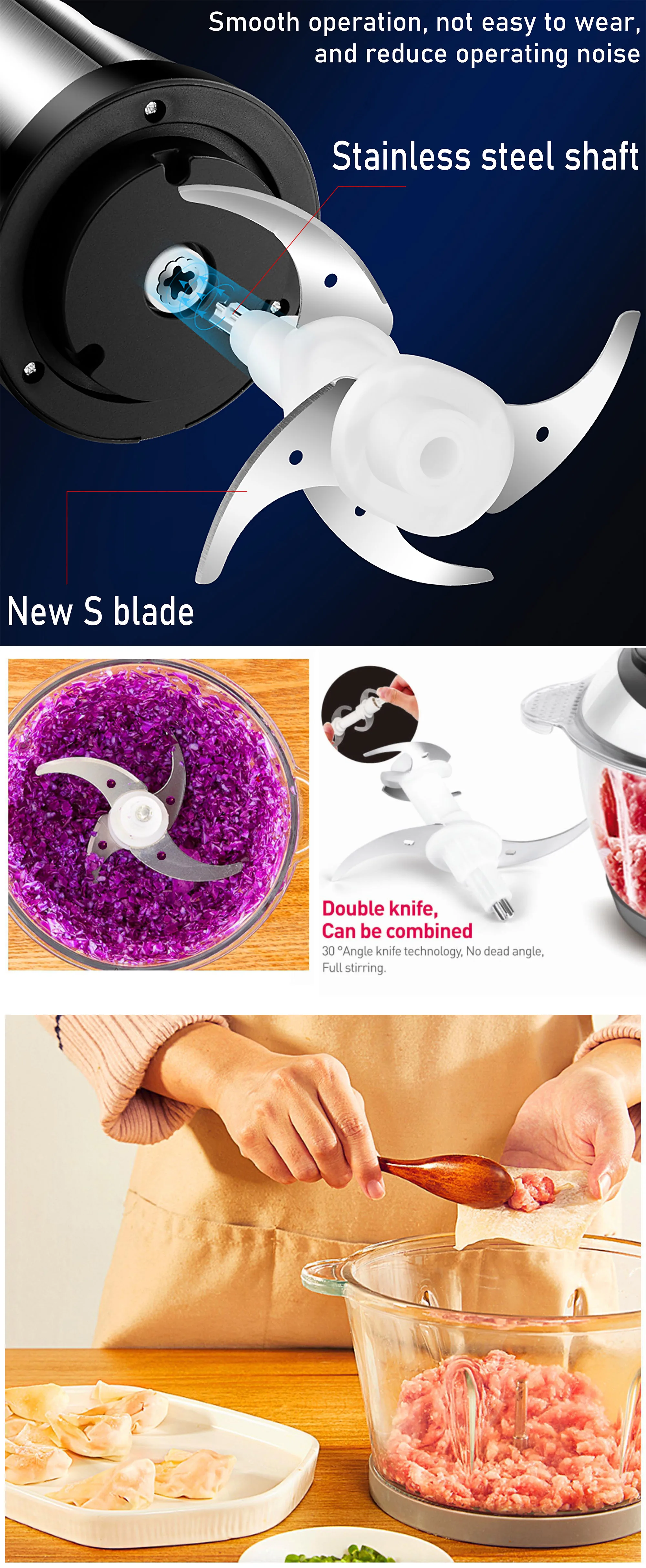 2 швидкості управленияС високою і низькою швидкістю управління, Електричний подрібнювач дозволяє вільно вибирати точний контроль, щоб виробляти ідеальну текстуру ваших інгредієнтів. Висока швидкість хороша для м'яса, горіхів, моркви, гарбуза; Повільна швидкість застосовується для яєць, овочів, фруктів і т. д. Виберіть правильну робочу швидкість, щоб служити вам.4 гострі леза з нержавіючої сталиИзготовлено з нержавіючої сталі 4. Різні леза з різною висотою забезпечують можливість подрібнення інгредієнтів під всіма кутами. Нарізати більш рівномірно і забезпечити ефективну роботу. Легко фарбу, міцний і не іржавіє.